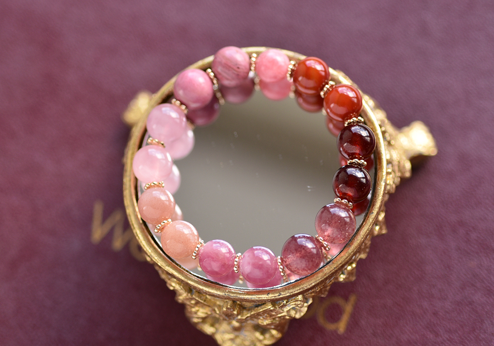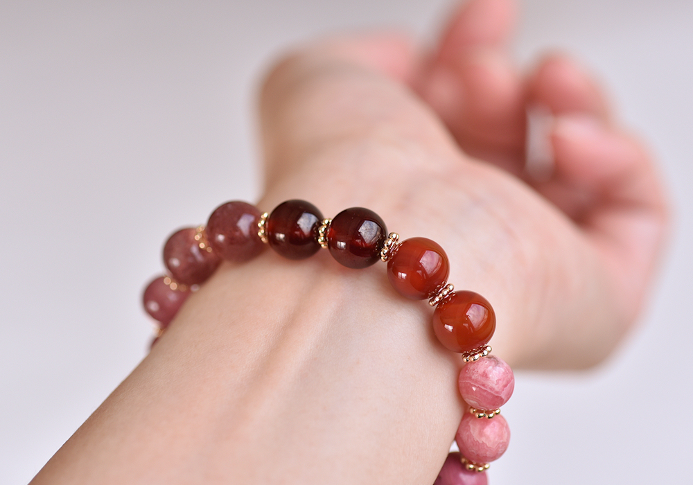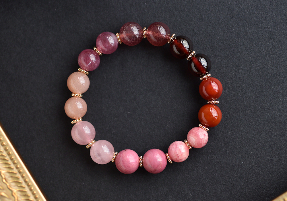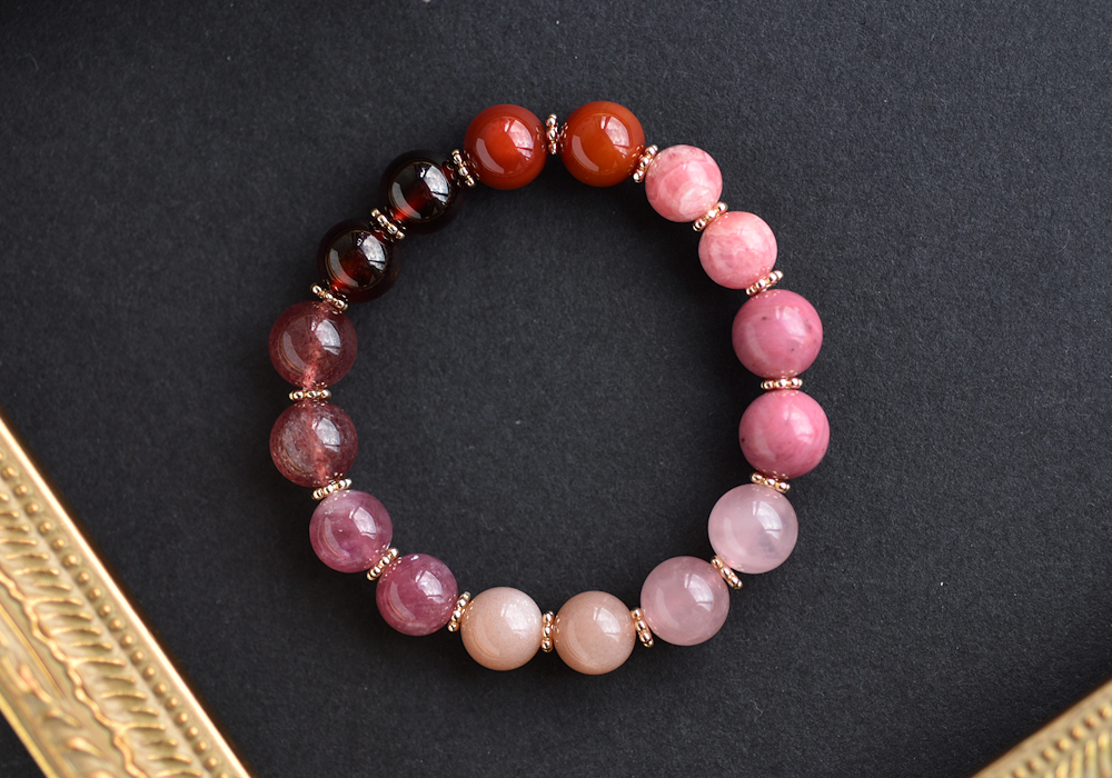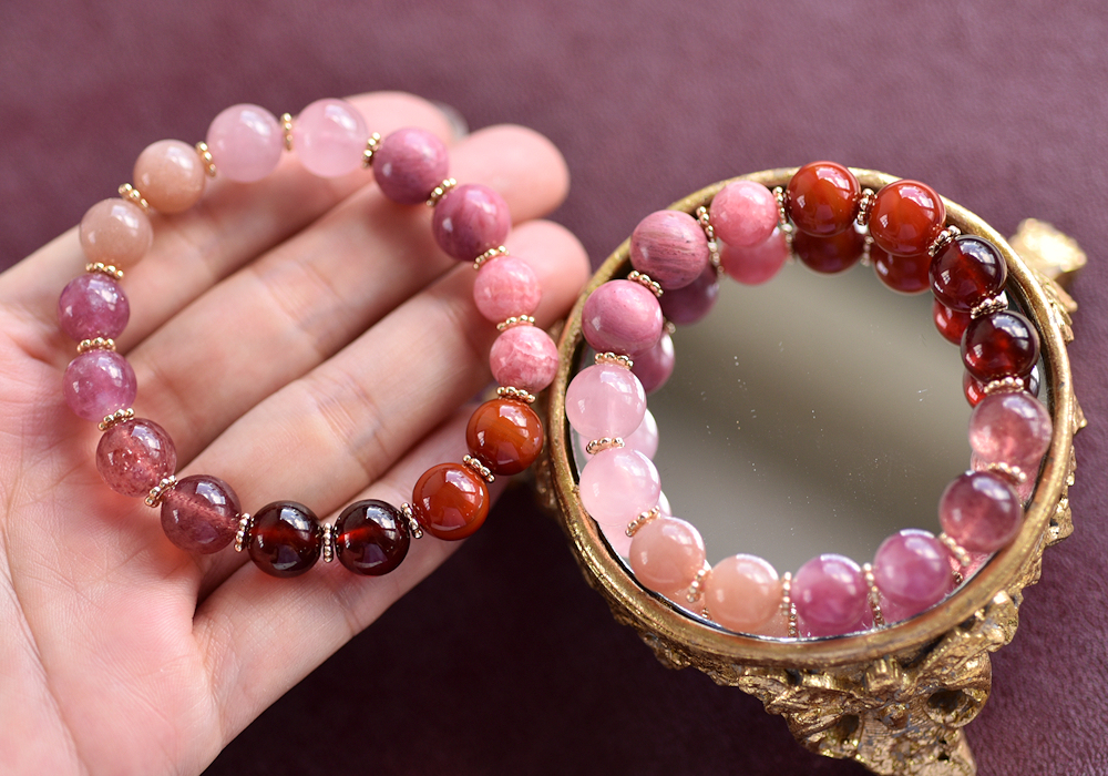 **石榴石+草莓晶+菱錳礦+碧璽+南紅瑪瑙+粉晶暖色系水晶手鍊**
