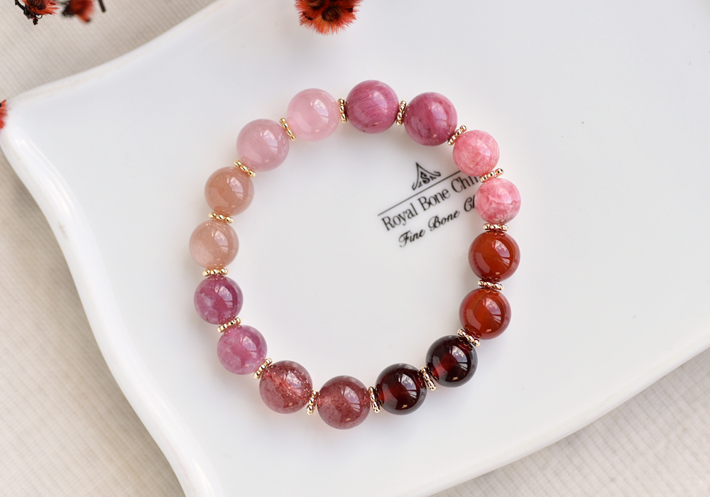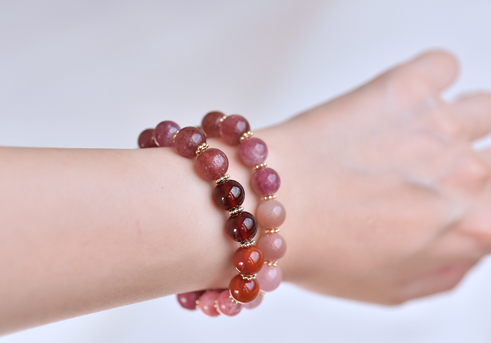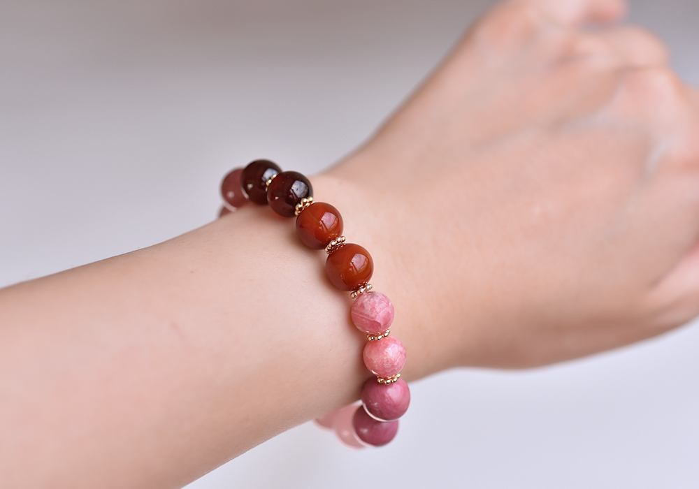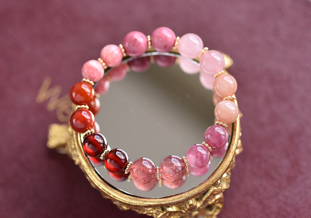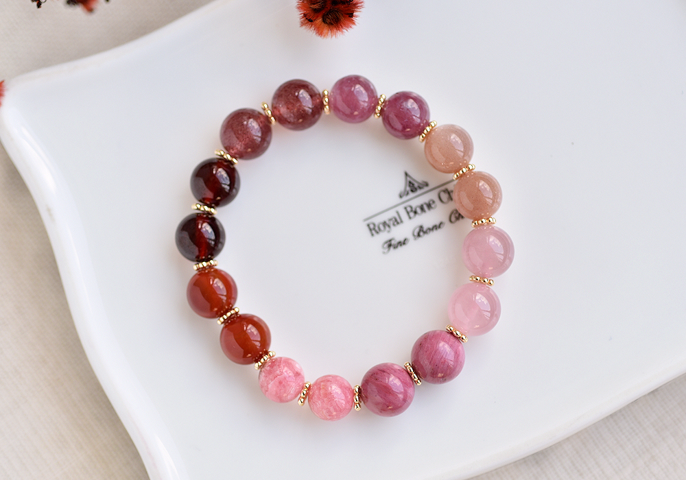 **石榴石+草莓晶+菱錳礦+碧璽+南紅瑪瑙+粉晶暖色系水晶手鍊**