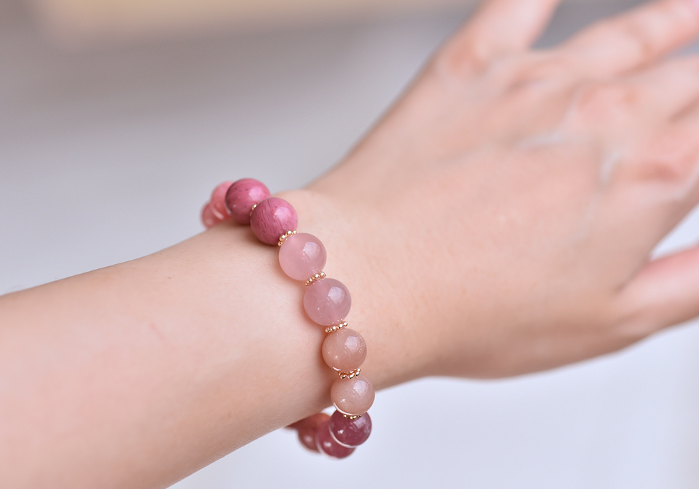 粉紅色馬島粉晶、菱錳礦(會有白紋)、貓眼橘月光石(會有石紋,不是破損喔!)